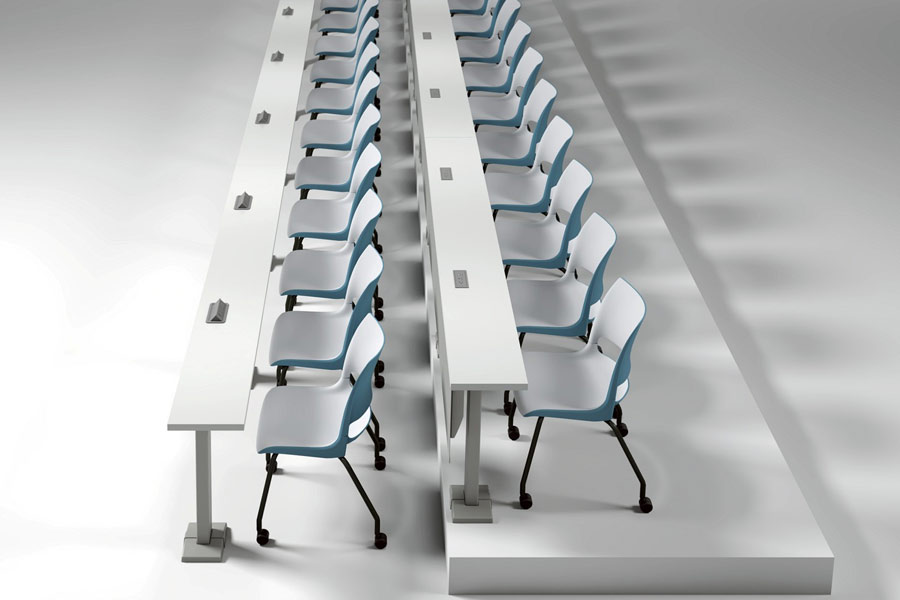 Designed to accommodate a diverse array of spatial needs, Fixed Seminar Tables stand as a versatile solution. Anchored by cantilevered pedestal legs, these tables provide unwavering support for uninterrupted table tops, allowing for arrangements that span straight, curved, or angled configurations.