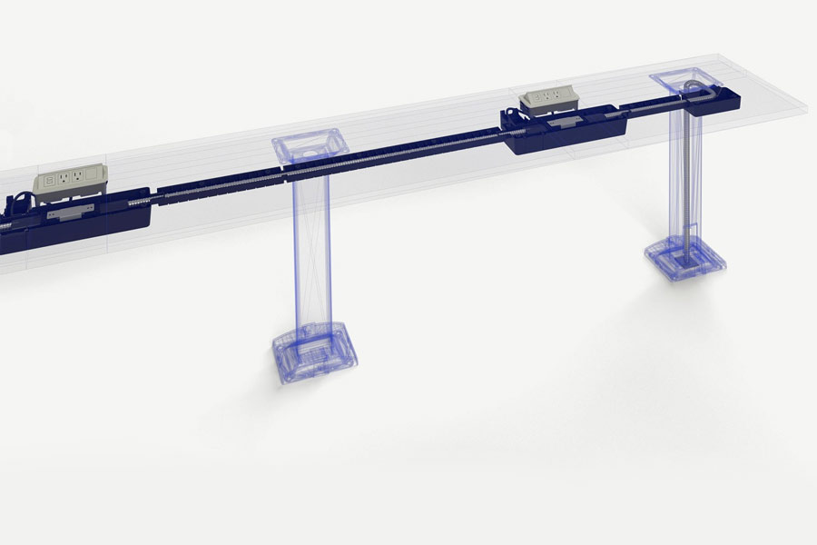 - Permanently mounted pedestal legs support continuous worksurfaces arranged in straight, curved or angled configurations