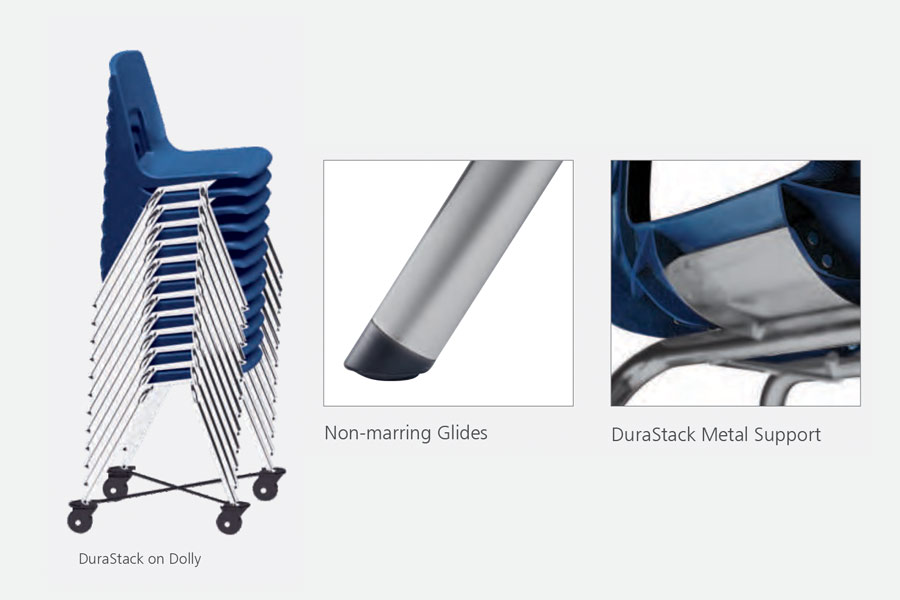 Relocating these chairs is a breeze. Stack them 12 high on a dolly and they still fit easily through a normal doorway. Non-marring glides stay put with a unique flush design that can't be knocked off. For extra chair shell strength and support (critical when the chair is used by larger individuals) the DuraStack chair has a metal support plate.