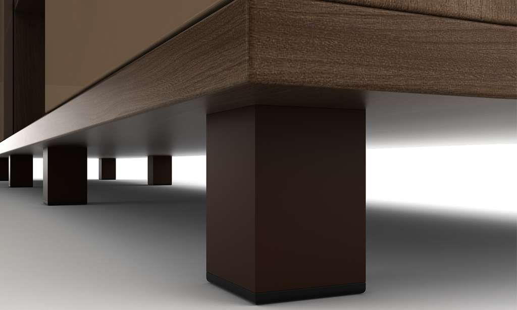 It features aluminium legs for the storage below, adding a touch of elegance.