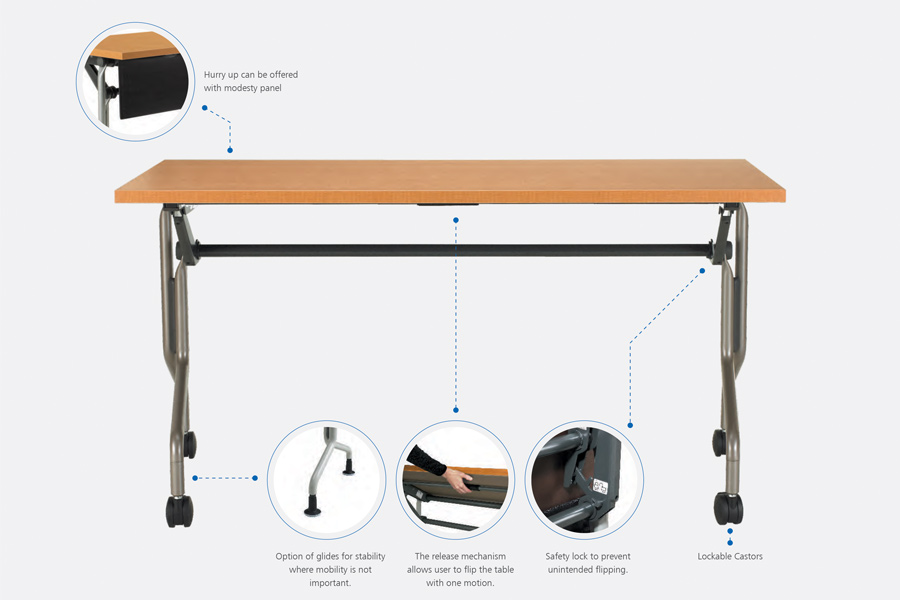 The Hurry Up! table is achieved through an innovative leg-within- leg design. Tables rest in a straight line, conserving space.