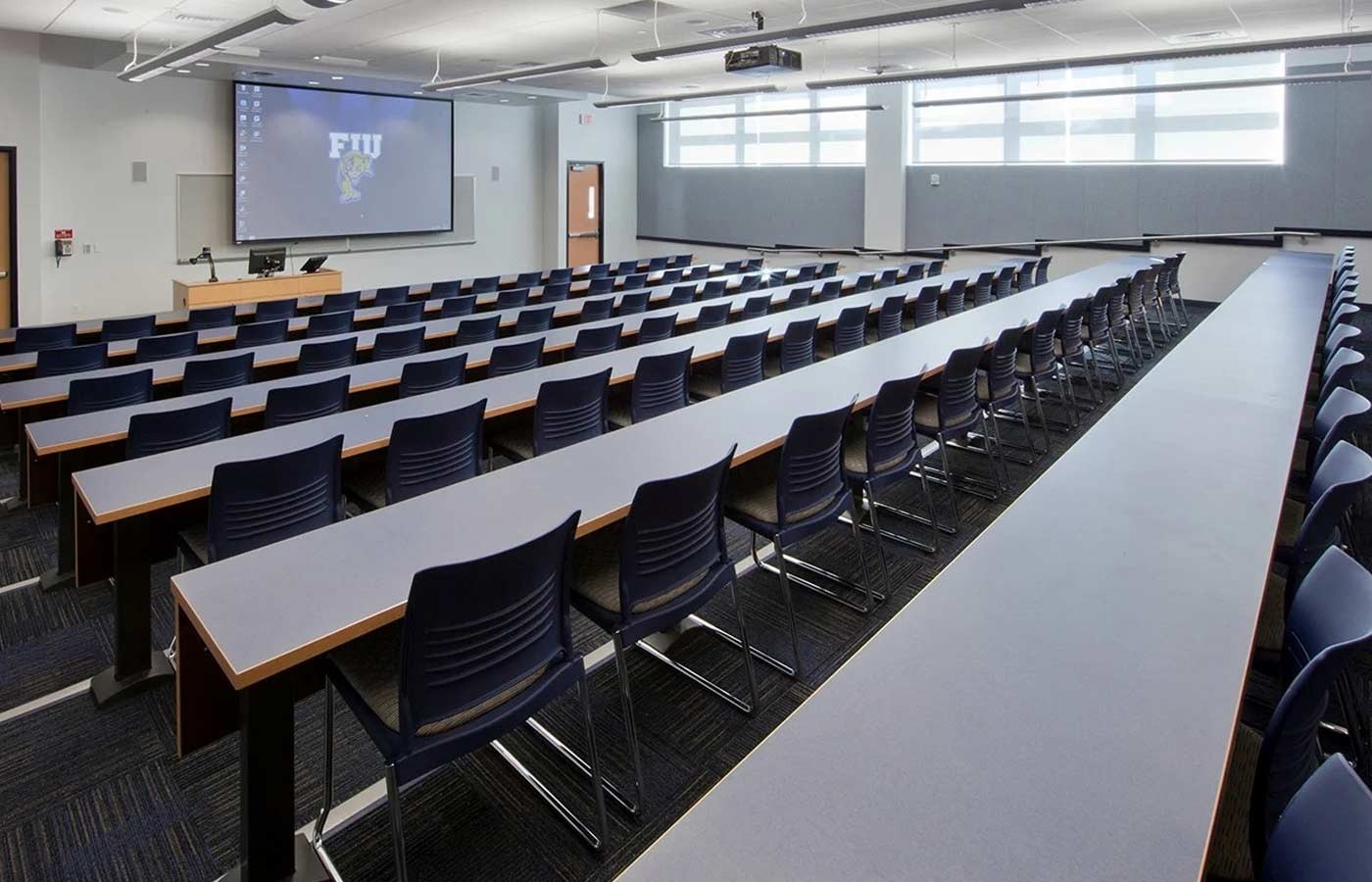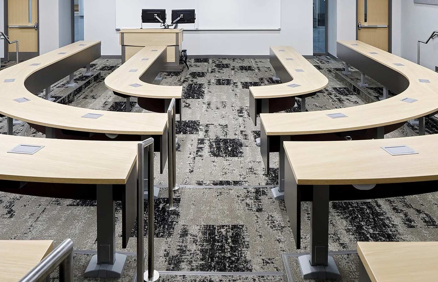 Designed to accommodate a diverse array of spatial needs, Fixed Seminar Tables stand as a versatile solution. Anchored by cantilevered pedestal legs, these tables provide unwavering support for uninterrupted table tops, allowing for arrangements that span straight, curved, or angled configurations.