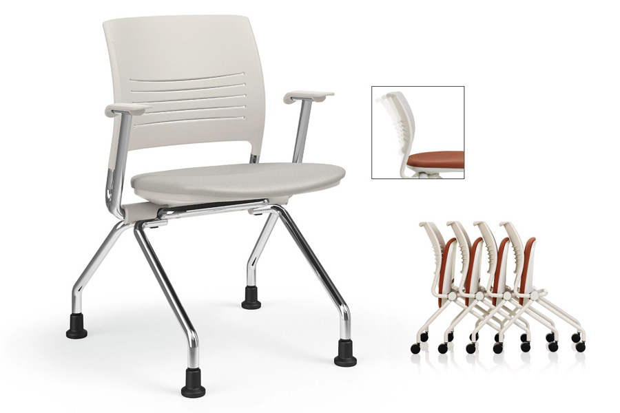 To accommodate the needs of any space, Strive nesting chairs are available with T-arms or tablet arms. Standard or oversize tablet arms provide a functional worksurface for personal items.